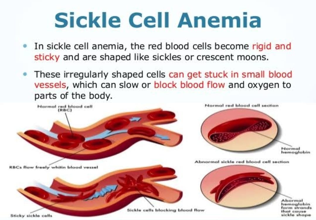 A mutation causes red blood cells to become rigid, sticky, and C-shaped (“sickled”). These cells break down more quickly, causing anemia. They can block small blood vessels, leading to painful crises and organ damage.